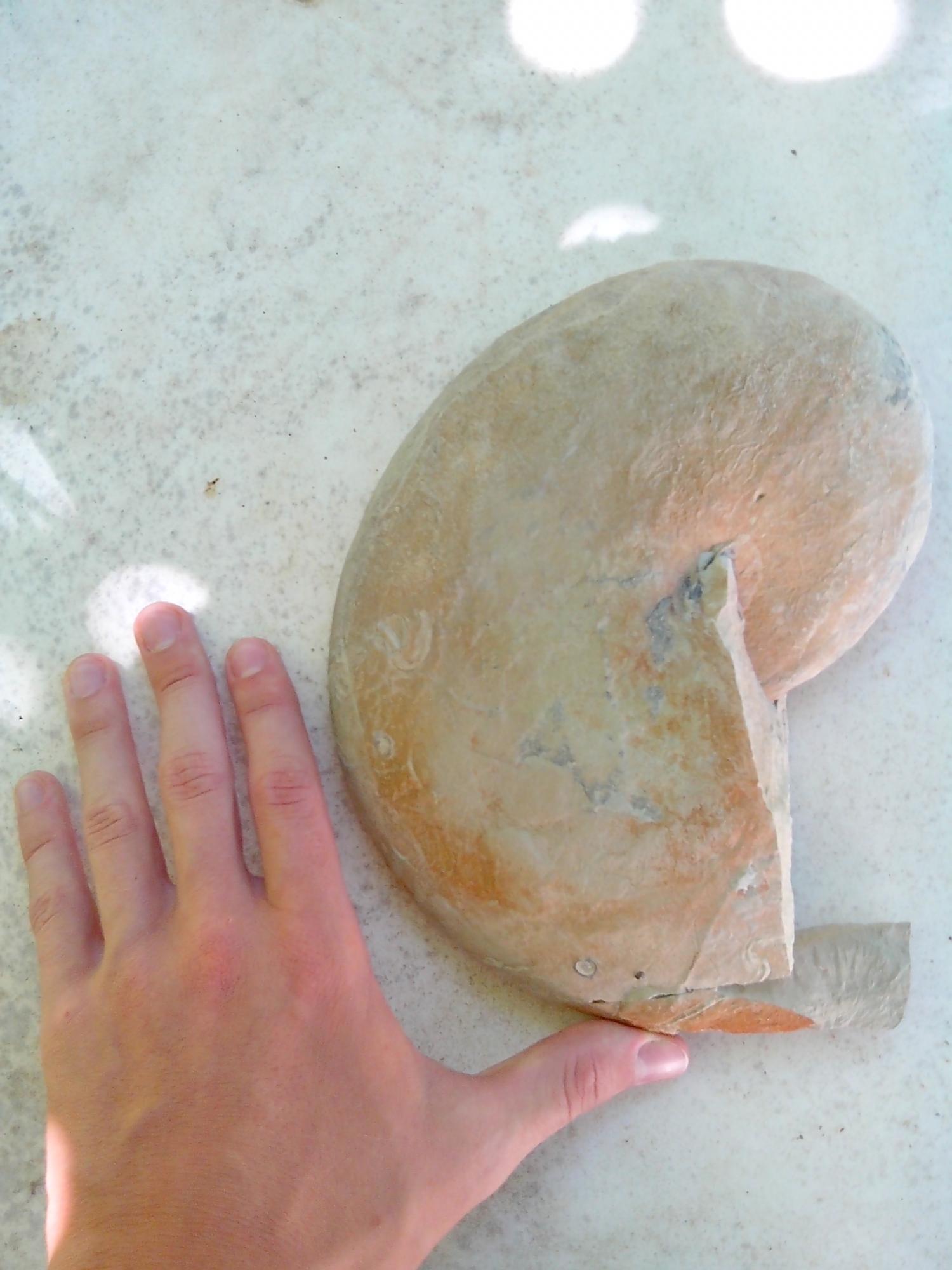 En plus des oursins, j'ai trouvé deux ammonites. La première (que je n'ai pas en photo) est lisse, "ovalisée" et mesure 6/7cm dans sa plus grande longueur : elle n'est pas entière, assez abîmée, et un coup de brosse à dent a magnifiquement enlevé les quelques colorations qui auraient permis son identification:pff:
