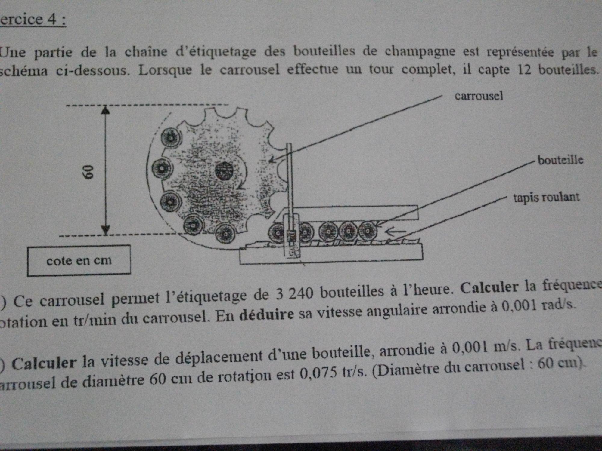 2) Calculer la vitesse de déplacement d'une bouteille, arrondie à 0.001m/s. La fréquence du carrousel de diamètre 60cm de rotation est 0.075tr/s. (diamètre du carrousel: 60cm).